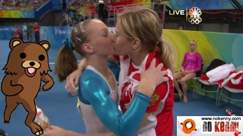 Un petit baiser entre deux gymnastes russes Sandra Izbasa et Yelena Zamolodchikova / Ksenia Semenova, j'espère que ça va inspirer les joueuses de beach volley...