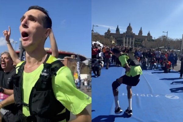 Le marathonien Morhad Amdouni fait tomber (involontairement ?) une rangée de bouteilles d’eau