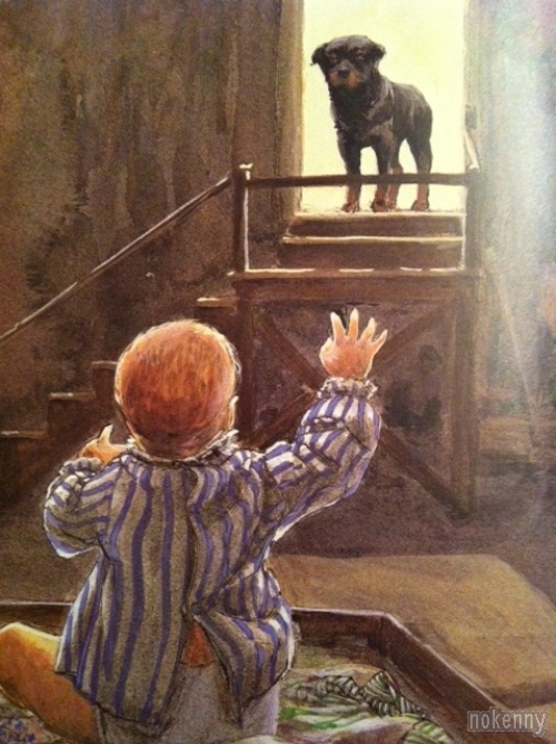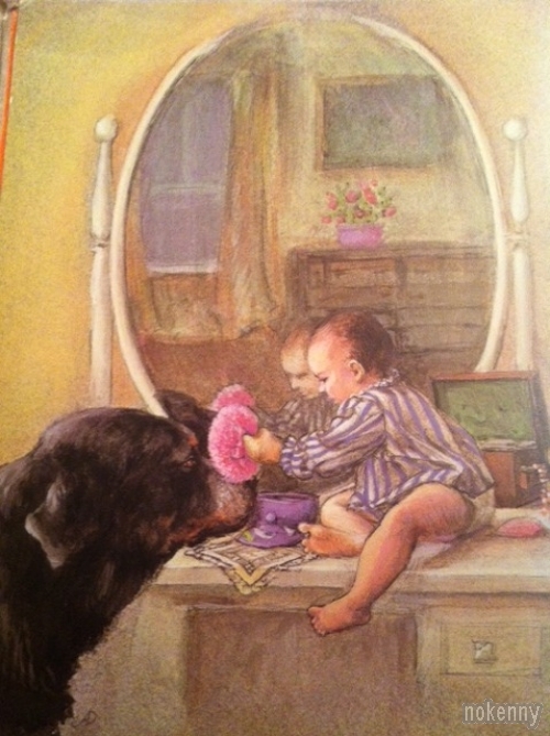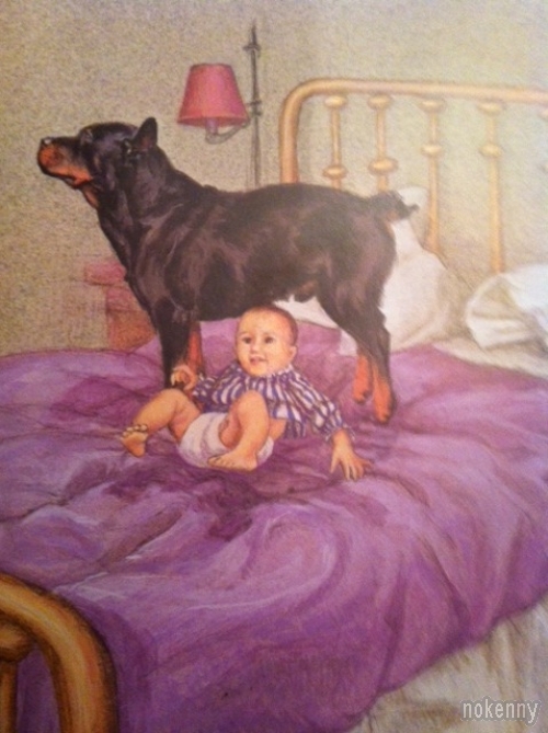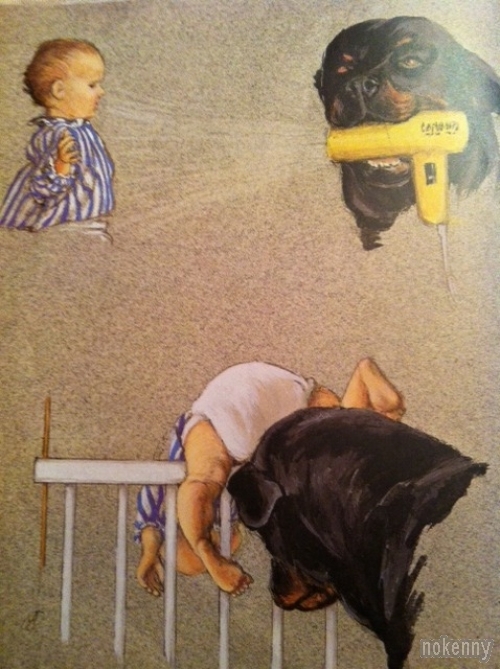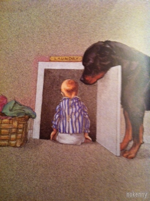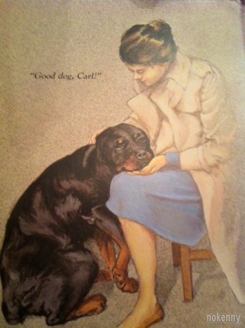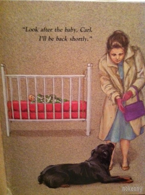 Quelques images d'une vieille bande dessinée américaine où une mère de famille demande à son chien Carl de surveiller son bébé. Good dog, Carl...