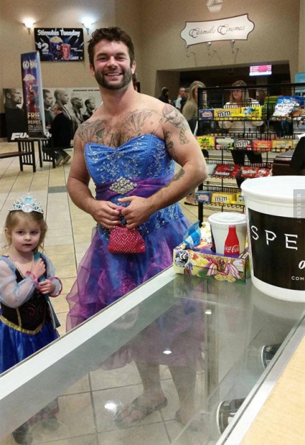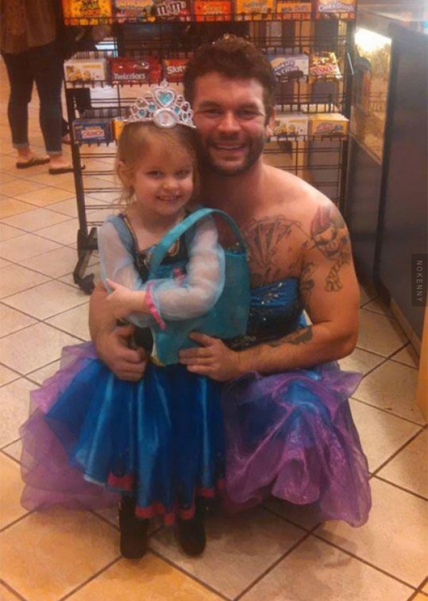 Du coup pour être sûr que sa nièce Izzy ne vive pas cela, cet oncle génial qui répond au nom de Jesse Nagy a décidé de l'accompagner en se déguisant lui aussi en princesse de Cendrillon.