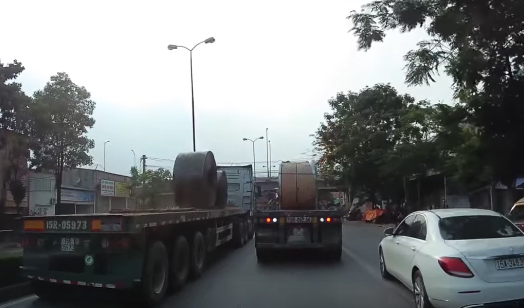 Au Vietnam, après avoir freiné brusquement un chauffeur de camion a fait rouler les grosses bobines d'acier qu'il transportait.