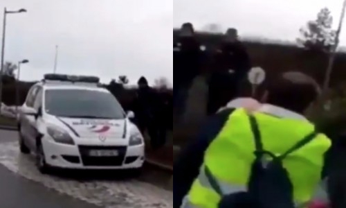 Sur un rond point un policier a au le brillante idée de "s'attaquer" tout seul à des Gilets Jaunes, après avoir repoussé fermement une femme il s'est retrouvé assailli de tous les cotés.