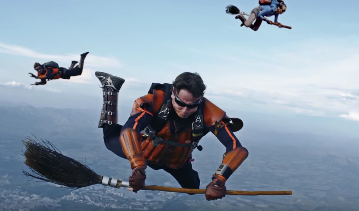 En plein ciel, des parachutistes colombiens équipés d'un balais s'offrent une bonne partie de quidditch moldu, le sport d'Harry Potter.
