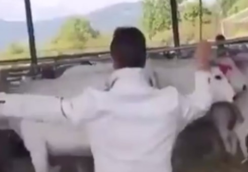 Dans une ferme un mec met des coups de baton à des vaches mais il va très vite se faire calmer.