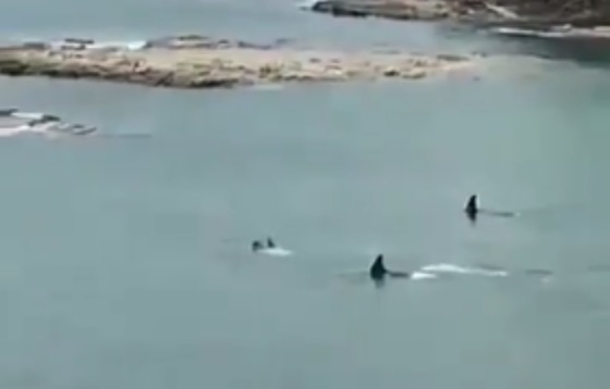 Sur une plage deux orques sont filmés en train de se diriger tout droit vers deux enfants.