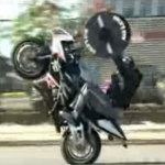 Au guidon d'une grosse moto un motard s'amuse à faire des haltères. Le tout bien sur, car c'est pas assez difficile, pendant un wheeling.
