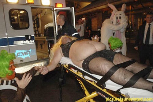 Je ne sais pas si c'est les deux lapins dévastés en fond, les deux oompa-loompas ou le gros poilu en porte-jartelle sur le brancard qui me font le plus marrer.