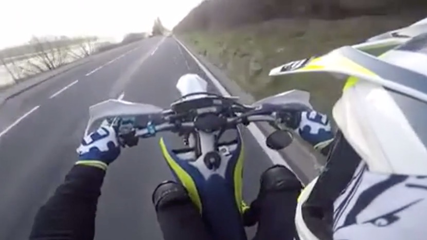 Après avoir enchainé des wheelies sur une voie rapide, un biker en motocross va se faire rattraper par le karma représenté ici par un motard de police.