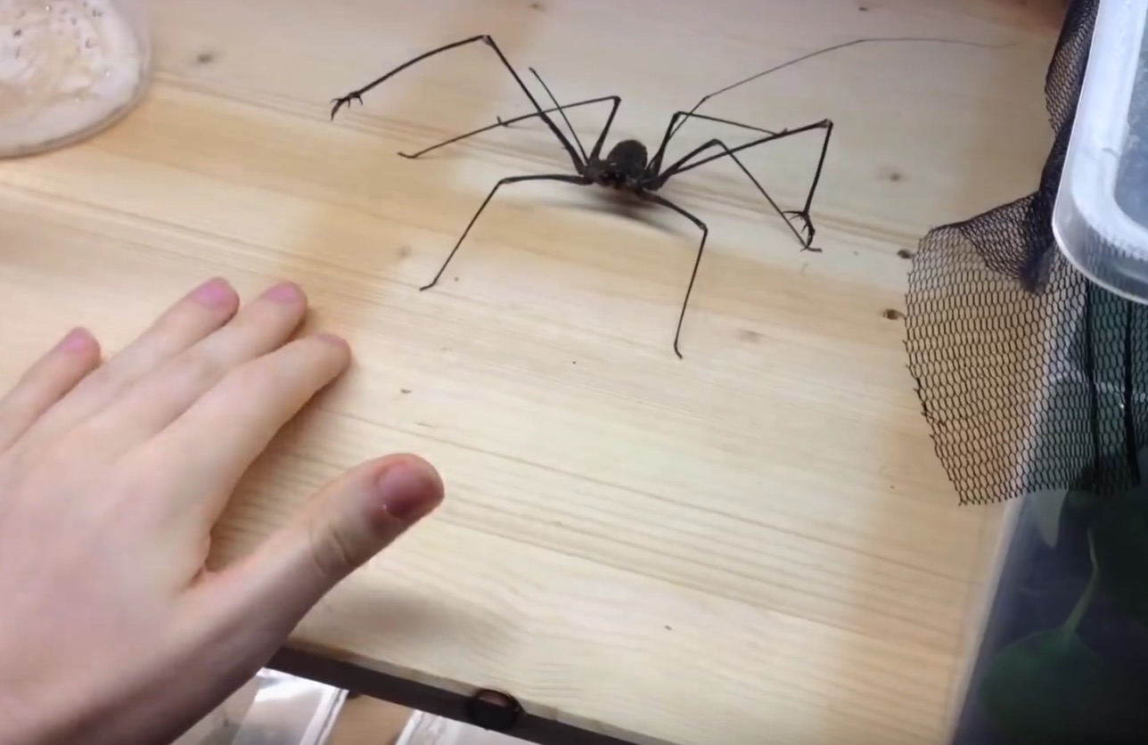 Un mec s'amuse à jouer avec une énorme Euphrynichus amanica, une espèce d'amblypyges de la famille des Phrynichidae (Arachnides).
