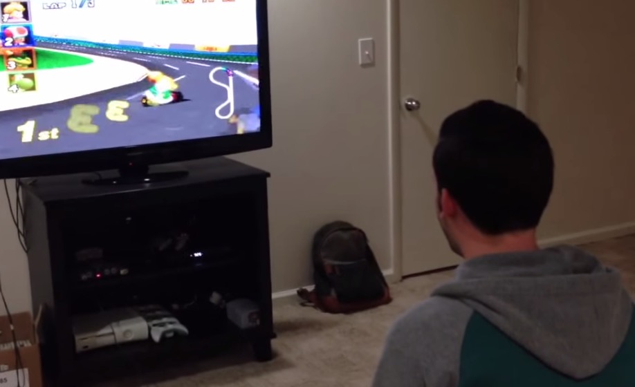 Un mec se fait une partie de Mario Kart avec un système de son de très haute qualité.