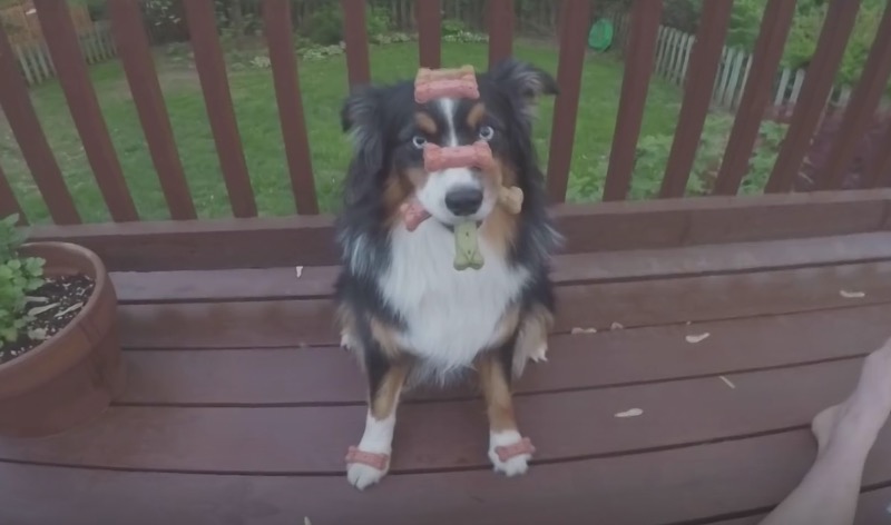 Au calme dans son balcon, un homme s'amuse à poser des croquettes en forme d'os sur la tête et le museau de son chien. On appréciera la patience du toutou.