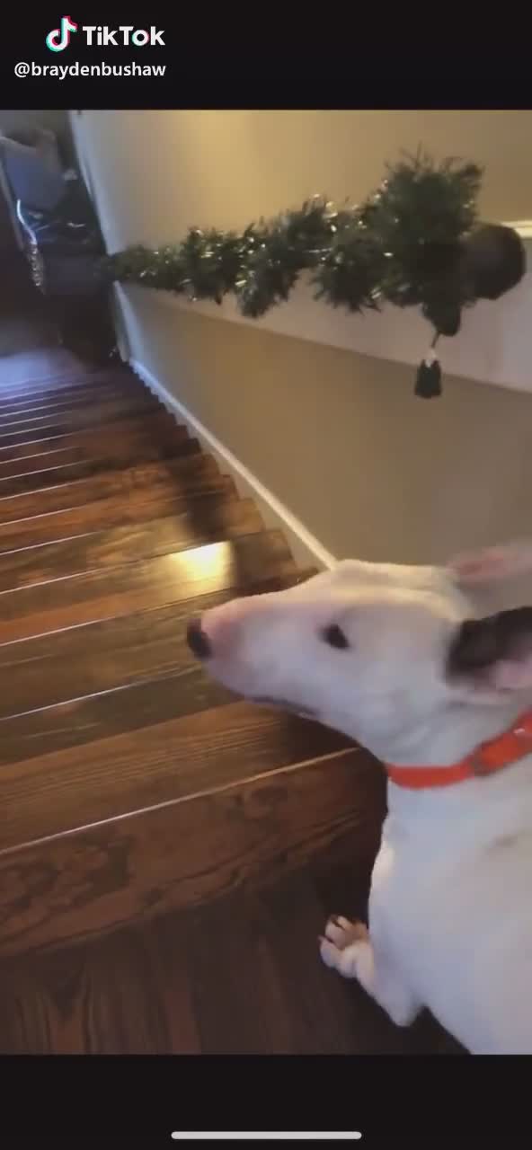 Un bull terrier doit descendre un escalier