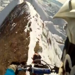 Avec une caméra embarquée un type très couillu nous emmène faire un tour de motocross Sur la neige, en haut d'une montagne.