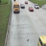 Vidéo impressionnante prise par un amateur sur un pont surplombant une autoroute, où l'on peut voir un oiseau, un pigeon en pleine rébellion avec lui même, traverser "à pattes" une route blindée de voitures.