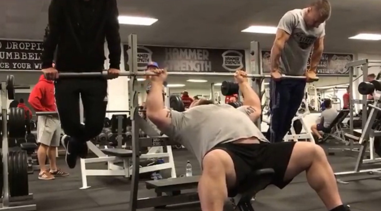 Dans une salle de musculation un homme fait du développé couché en utilisant deux autres gars comme poids.