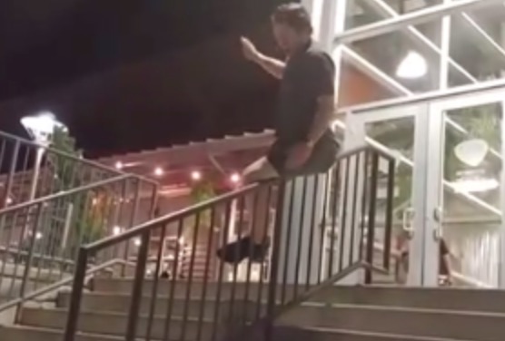 Régis veut descendre les escaliers avec classe comme dans certains films mais il va juste ridiculiser.