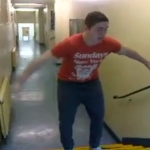En haut d'un petit escalier, sans doute dans son école, notre ami Régis va réaliser un demi backflip. Pas mal la réception...