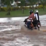 En Asie du est pendant les inondations, un couple conduit un scooter sur l'eau, une tâche tout aussi difficile que risquée car on ne sait jamais ce qui peut se cacher sous les profondeurs.