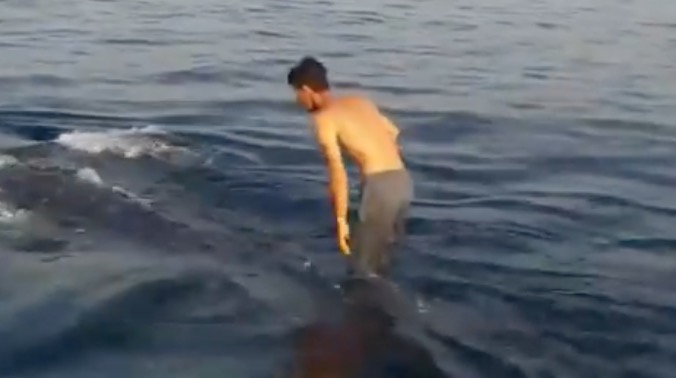En Iran dans le golfe Persique, un pêcheur descend calmement de son bateau pour aller surfer sur un requin baleine.