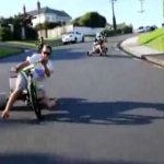Tractés sur le départ par des voitures, des types se payent une bonne course façon Mariokart en tricycle. Bon dommage quand même il manque un bon gros crash...