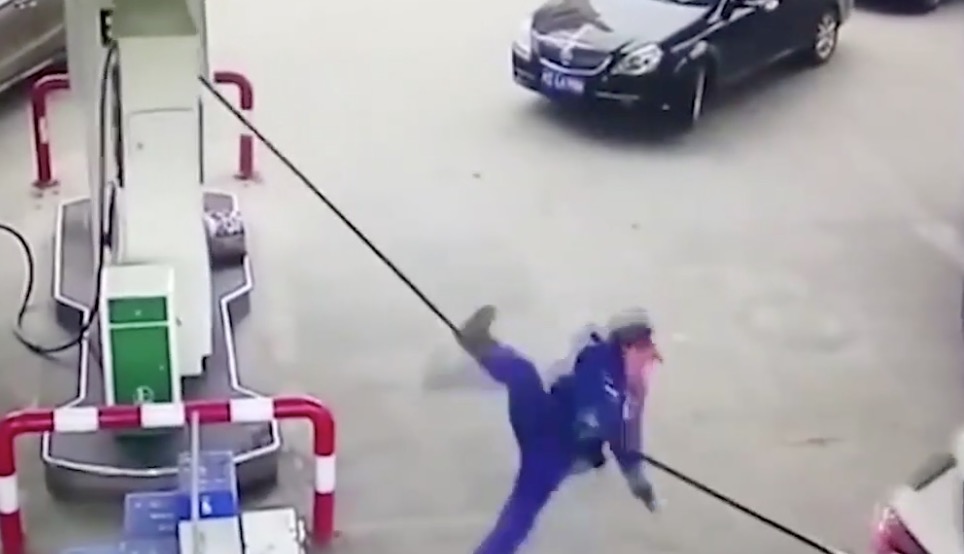 Alors qu'il se faisait mettre de l'essence, un automobiliste va partir d'un coup et emporter la borne ainsi que l'employée dans sa connerie.