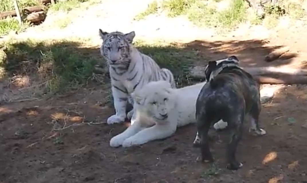 Dans un zoo un bulldog qui semble bien excité joue à se battre avec deux tigres.