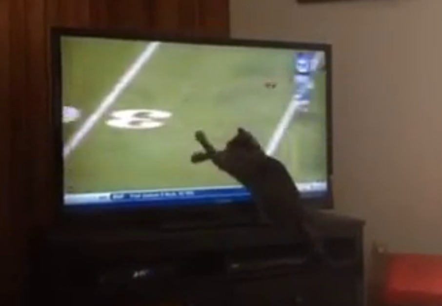 Devant un match de football américain, un chat grimpe sur la télé pour essayer d'attraper le ballon. Bon bah au moins c'est clair qu'il aurait pas pu faire carrière.