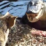 Gros duel de la nature aujourd'hui, un chat qu'on appellera "badass" se bat avec un alligator pour bouffer les restes d'un poulet.
