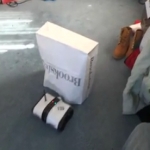 Un aspirateur robot cherche la mélasse avec un chat (modèle dernière génération avec camouflage sac de shopping), inconscient...