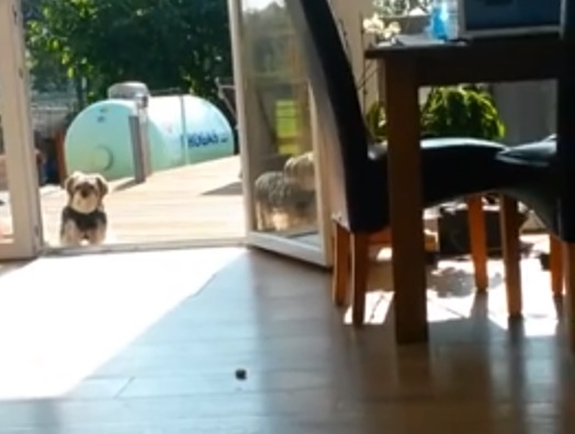 Un chien attend qu'on lui ouvre une porte déjà ouverte