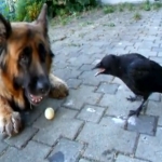 Un chien joue avec un corbeau
