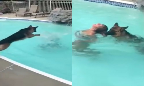 Dans une piscine en Floride, un chien plonge pour sauver sa maitresse d'une mort certaine. Pour les curieux il s'agit de Lauren Bright.