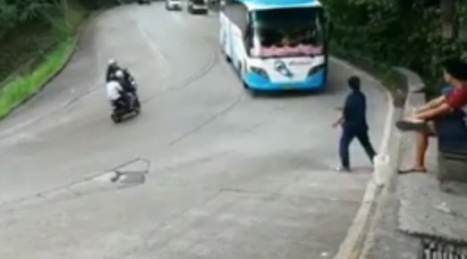 En Thailande, alors que les freins d'un autocar ont lâché, un homme est filmé en train de sauter (tomber ?) juste avant que son véhicule termine dans une barrière de sécurité.