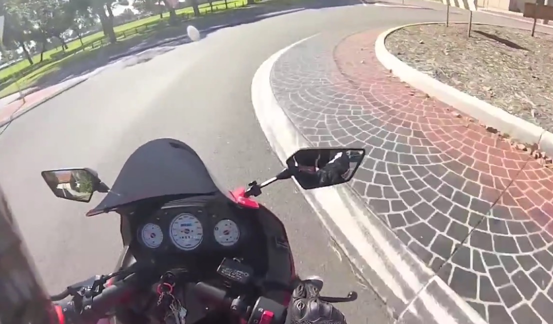Poussé par la flemme ce motard australien ne va pas prendre la peine de prendre correctement un rond point, résultat des courses : un bon coup de flippe et 1000 dollars de réparation.
