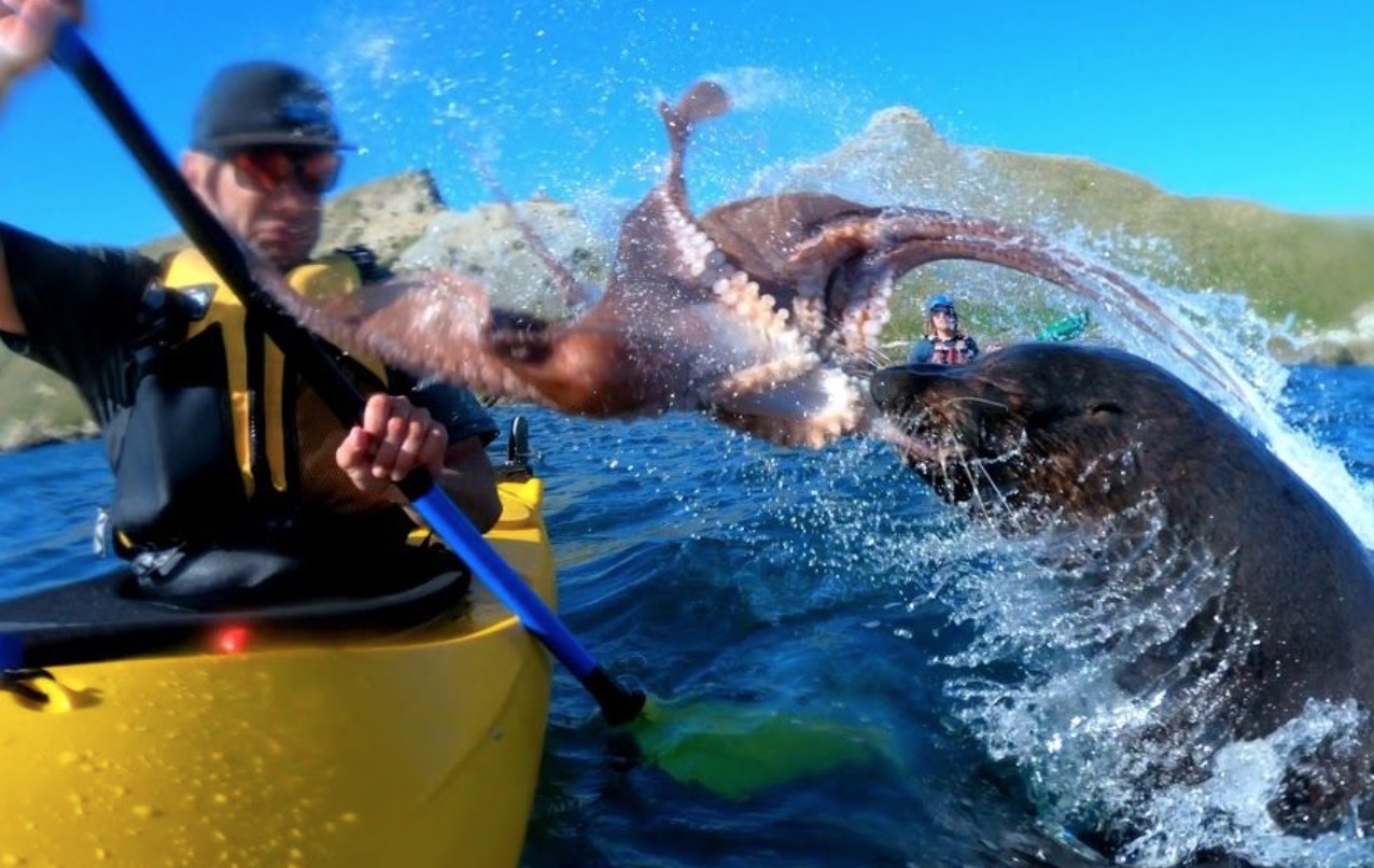 En Nouvelle-Zélande, un kayakiste qui doit avoir une sacrée tête à claque, a eu la surprise de voir un phoque sortir sa tête de l'eau pour le gifler avec... un poulpe...