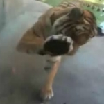 Grosse désillusion pour ce tigre en cage qui va essayer tant bien que mal pendant une bonne minute d'attraper les pantoufles de tigre d'une visiteuse.
