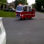 Au Canada un homme filme avec beaucoup d'amusant un minuscule camion de pompier qui traverse sa rue.