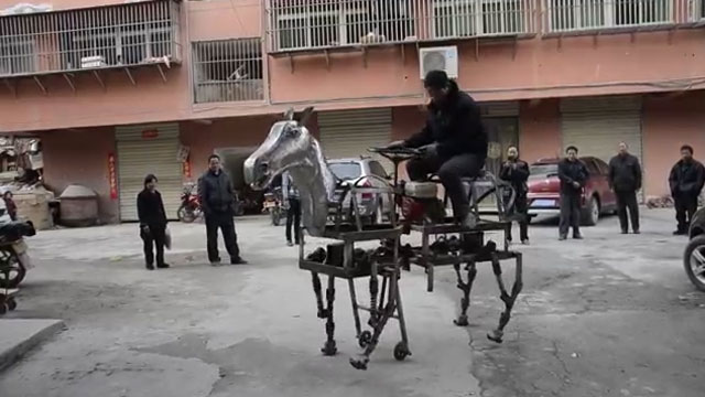 En Chine un homme présente sa drôle de charrette, une charrette à moteur qui avance avec un genre de robot cheval.
