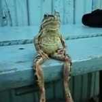 Après le chat qui attend la fin du monde, voici la même vidéo avec une grenouille tellement cool qu'elle profite simplement du beau temps en restant assise sur un banc.