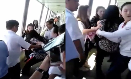 Après avoir fait tomber son téléphone cette touriste chinoise a voulu sauter dans l'eau pour le récupérer, malheureusement le personnel l'a empêché.