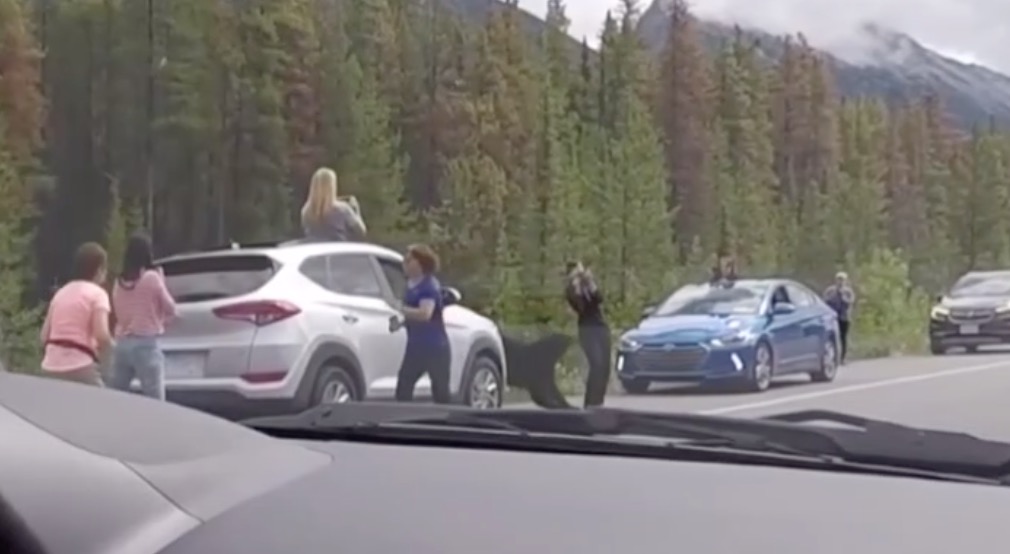En filmant un ours de trop près sur le bord d'une route, une touriste a failli passer la pire minute de sa vie.
