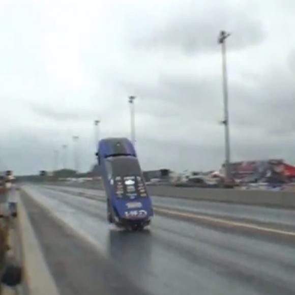 Dans une course de "drag car" un pilote va avoir la mauvaise surprise de voir son véhicule décoller de la route.