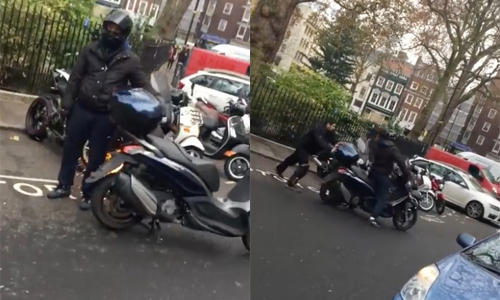 A Londres, deux mecs tentent de voler une moto à la disqueuse dans le plus grand des calmes jusqu'au moment où des passants vont intervenir et finir par les faire changer d'avis.